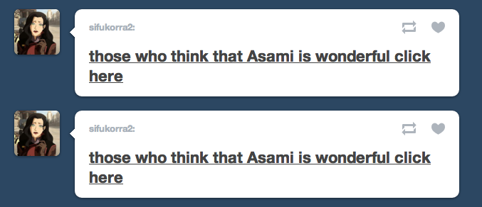–Sorry, it is true that there is no new episode airing this weekend. But a new Korra will be on next Saturday, June 2nd. And it’s a doozy. A REAL DOOZY. In the meantime, Nick.com wanted me to let you all know they made a playlist where you can watch the first seven episodes online, in case you need to catch up, or convert friends, family, babysitters, family pets, etc. Here’s the link: http://at.nick.com/Lv4P9O